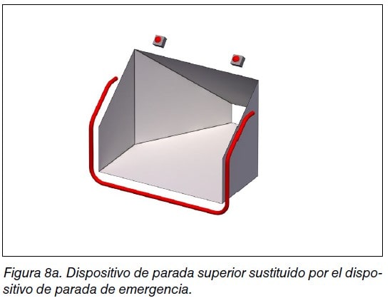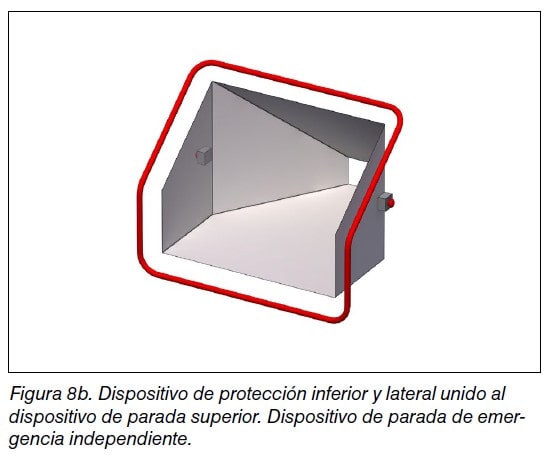 En la figura 5 se muestra un ejemplo de la disposición de los mandos de los componentes de alimentación, así como de los dispositivos de protección inferior, de protección lateral, de parada superior y de parada de emergencia, que se desarrollan en los siguientes apartados de esta NTP.