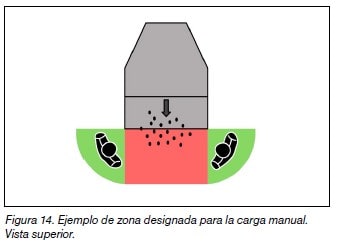 Se define la zona designada para la carga manual como el área donde el operador debe situarse para alimentar manualmente la máquina.