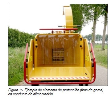 La madera y las partículas expulsadas desde del conducto de alimentación pueden suponer un riesgo para las personas situadas cerca de la máquina. Con objeto de reducir este riesgo, se puede instalar un elemento de protección en el conducto de alimentación (por ejemplo, tiras de goma, figura 15) que en la medida de lo posible no dificulte la visibilidad de los componentes de alimentación.