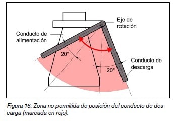 El conducto de descarga no debe poder situarse sobre el conducto de alimentación durante el proceso de triturado. Para ello, el movimiento de rotación del conducto de descarga debe estar limitado, de modo que su plano central vertical no pueda acercarse a menos de 20o respecto a una línea imaginaria que une el eje de rotación y el borde exterior en cada lado del conducto de alimentación (figura 16).
