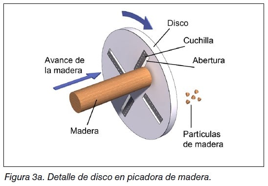 - a) Picadoras de madera tipo disco: disponen de cuchillas situadas en la cara de un disco rotatorio.