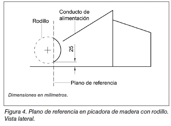 Un concepto fundamental en el diseño de las picadoras de madera es el plano de referencia que se define como el plano imaginario vertical perpendicular a la dirección de alimentación, situado en el punto más cercano a la persona mientras se realiza la alimentación, y donde existe una distancia de separación de 25 mm entre: