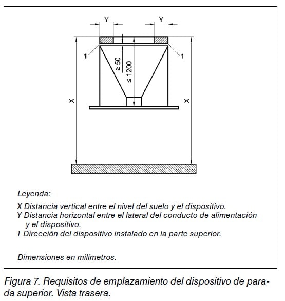 - La distancia del dispositivo de parada superior por encima del borde exterior superior del conducto de alimentación o, en su caso, de su estructura superior debe ser mayor o igual de 50 mm (figura 7).