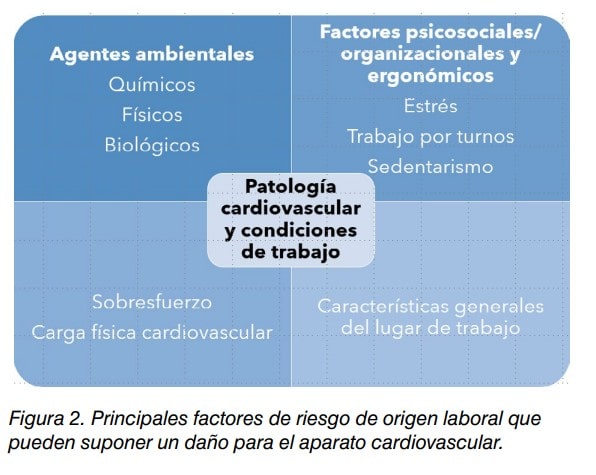 Estos factores pueden ser causa directa de daño (ej.: exposición a fósforo como causa de miocarditis tóxica), contribuyente al asociarse con otros factores de riesgo personales o extralaborales (ej.: trabajo a turnos asociado a hábitos de vida no saludables) o precipitante externo (situación estresante que desestabiliza una enfermedad cardiovascular preexistente).