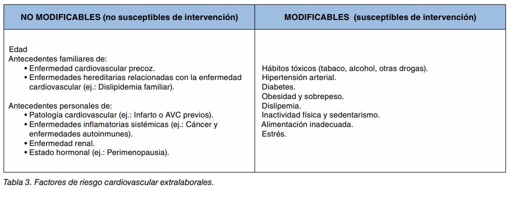 - Identificación, seguimiento y control de los factores de riesgo no laborales para la salud cardiovascular tanto a nivel individual como colectivo orientando las intervenciones en función del nivel de riesgo. Por la relevancia que están cobrando en los últimos tiempos, se recomienda prestar especial atención a dos grupos de elevada vulnerabilidad ante la patología cardiovascular: mujeres en la etapa perimenopáusica y personas afectadas por procesos oncológicos.