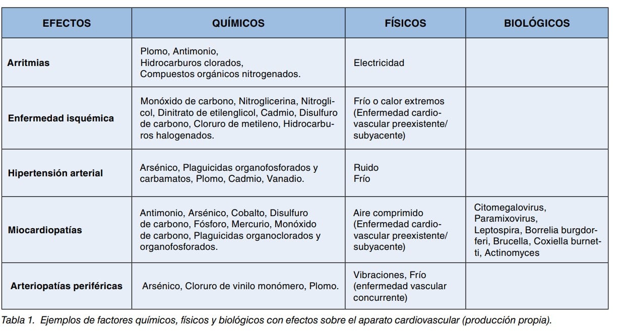En la tabla 1 se listan los principales efectos sobre el aparato cardiovascular (agudos o crónicos) y algunos ejemplos de agentes químicos, físicos y biológicos que pueden producirlos.