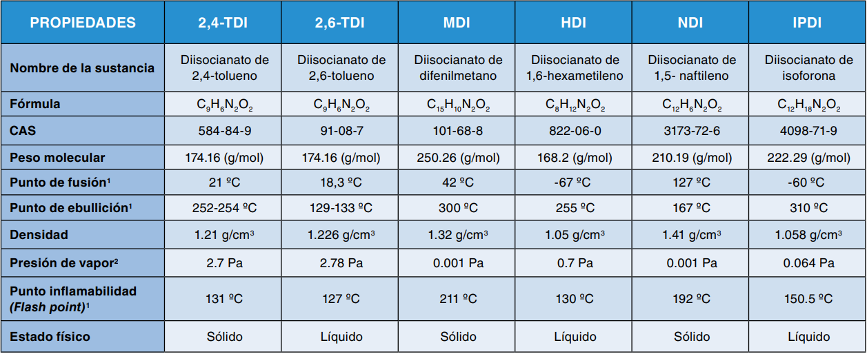 Entre los diisocianatos más importantes en entornos industriales están los siguientes (ver tabla 1 y tabla 2):