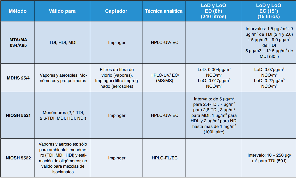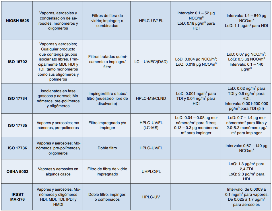 Algunos de los métodos disponibles para muestrear diisocianatos y analizar grupo isocianato -NCO se indican a continuación: