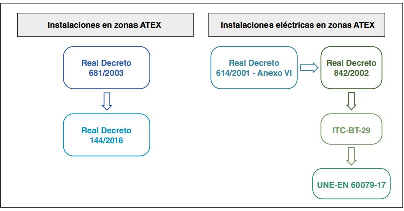- El Real Decreto 842/2002, de 2 de agosto por el que se aprueba el reglamento electrotécnico de baja tensión (REBT), específicamente, en la ITC-BT-29 Prescripciones particulares para las instalaciones eléctricas de los locales con riesgo de incendio o explosión, incluye obligaciones específicas en cuanto a la selección e instalación de equipos eléctricos en zonas ATEX y en cuanto al mantenimiento e inspecciones a que deben someterse. Con respecto a la selección e instalación, remite a la norma UNE-EN 60079-14 Atmósferas explosivas. Parte 14: Diseño, elección y realización de las instalaciones eléctricas. Por otra parte, referente a las inspección y mantenimiento, remite a lo dispuesto en la norma UNE-EN 60079-17.