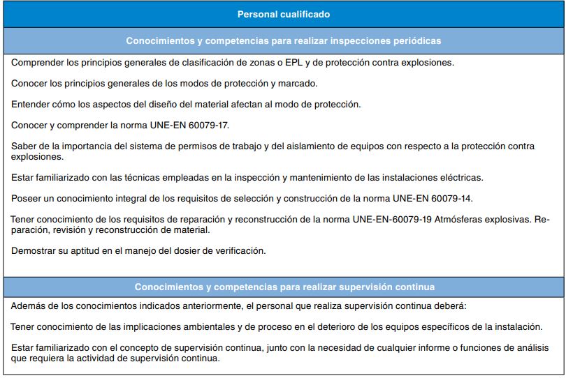 Tabla 2. Conocimientos y competencias del personal cualificado. Elaboración propia a partir del contenido de la norma UNE-EN 60079-17.