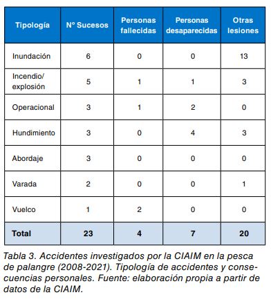 En la tabla 3 se puede observar la tipología de los accidentes investigados en la modalidad de palangre. Las tipologías más frecuentes fueron la inundación, con 6 sucesos, seguida del incendio/explosión, con 5 sucesos. A continuación, con tres sucesos en cada caso, le siguen los accidentes operacionales, el hundimiento y el abordaje. Además, se produjeron 2 accidentes por varada y 1 por vuelco.