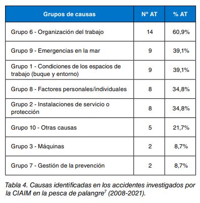 De los 237 accidentes marítimos muy graves ocurridos en buques pesqueros durante el periodo comprendido entre octubre de 2008 y diciembre 2021 e investigados por la CIAIM, 23 ocurrieron en buques dedicados a la pesca de palangre. Estos accidentes se saldaron con 4 personas fallecidas, 7 desaparecidas y 20 heridas. El tipo de accidente con más víctimas mortales fue el hundimiento con resultado de cuatro personas desaparecidas.