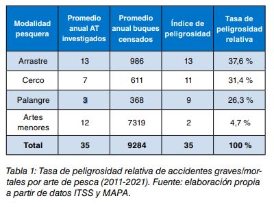 La tabla 1 muestra, para el periodo 2011-2021, los datos del promedio anual de accidentes graves/mortales investigados por la ITSS, el promedio anual de buques censados, el índice de peligrosidad (2) y la tasa de peligrosidad relativa (3) resultante, que permite comparar las cuatro principales modalidades de pesca La segunda fuente son los informes de investigación de accidentes muy graves y mortales en buques de pesca ocurridos entre 2008 y 2021 investigados por la Comisión Permanente de Investigación de Accidentes e Incidentes Marítimos (CIAIM), órgano colegiado adscrito al Ministerio de Transportes, Movilidad y Agenda Urbana.