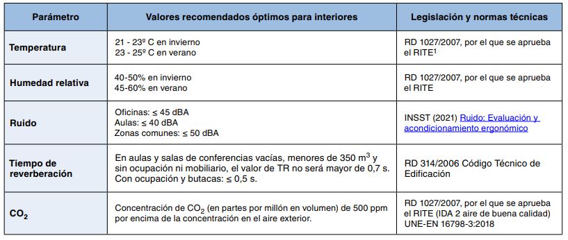En la Tabla 1 se relacionan algunos valores de referencia mencionados en el Real Decreto 1027/2007, de 20 de julio, por el que se aprueba el Reglamento de Instalaciones Térmicas en los Edificios, normas UNE, ISO y criterios técnicos que, aunque no están necesariamente relacionados con el riesgo vocal, son valores para tener en cuenta para establecer unas condiciones favorables para entornos de trabajo en interior.