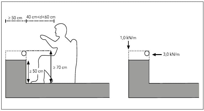 En las zonas de tráfico y aparcamiento, los parapetos, petos o barandillas y otros elementos que delimiten áreas accesibles para los vehículos deben resistir como mínimo una fuerza horizontal de 50 kN/m, uniformemente distribuida sobre una longitud de 1 m, aplicada a 1,2 m de altura sobre el nivel de la superficie de rodadura o sobre el borde superior del elemento si este está situado a menos altura. El valor concreto depende del uso específico y de las características del edificio y se definirá en el proyecto, no siendo inferior a qk = 50 kN.