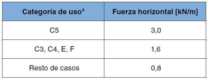 La estructura propia de las barandillas, petos, antepechos o quitamiedos de terrazas, miradores, balcones o escaleras debe tener una resistencia y una rigidez suficiente para resistir una fuerza horizontal, uniformemente distribuida, cuyo valor se indica en la tabla 1. La fuerza se considerará aplicada a 1,2 m o sobre el borde superior del elemento, si este está situado a menos altura.