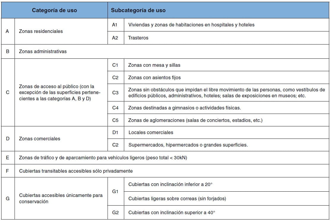 Tabla 2. Categoría y subcategoría de uso. (Fuente: CTE. DB SE-AE).