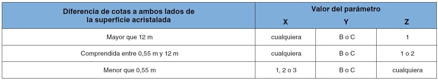 Los parámetros X y Z pueden adoptar los valores 1, 2 ó 3 (de más a menos resistente). La diferencia entre ambos es que, mientras para el parámetro X se admite una rotura con las características de un vidrio laminado o con las de un vidrio templado, para el parámetro Z solo se admite la rotura con las características de un vidrio laminado. Las condiciones técnicas requeridas en el ensayo a ambos tipos de rotura están especificadas en la norma.