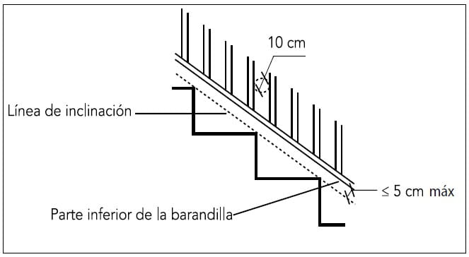 b) No tengan aberturas que puedan ser atravesadas por una esfera de 10 cm de diámetro, exceptuándose las aberturas triangulares que forman la huella y la contrahuella de los peldaños con el límite inferior de la barandilla, siempre que la distancia entre este límite y la línea de inclinación de la escalera no exceda de 5 cm (véase figura 8).