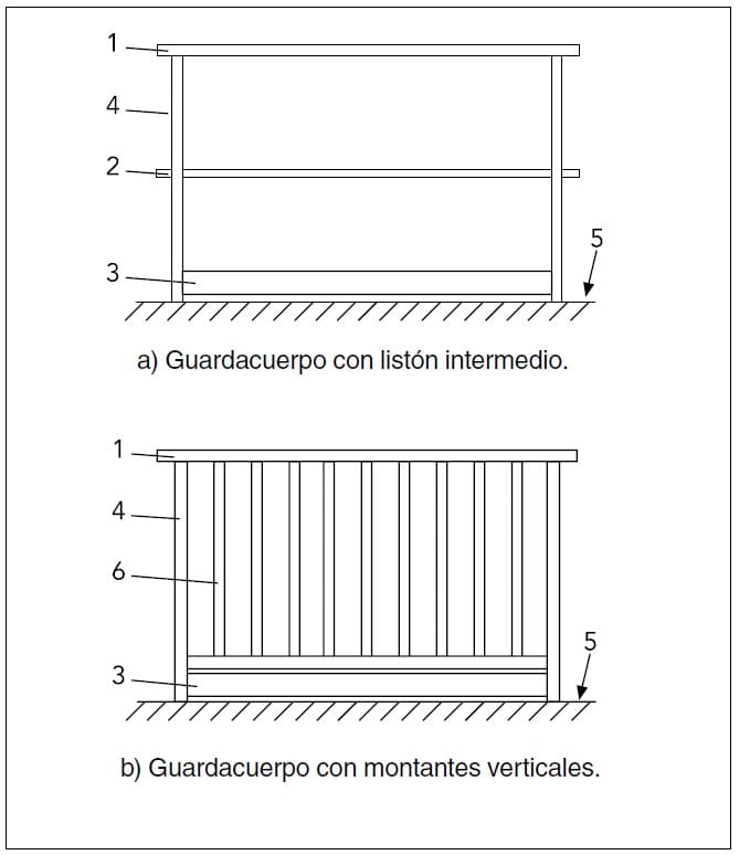 2 Figura 1 a) y b): 1 Pasamanos o barra superior, 2 Listón intermedio o barra intermedia, 3 Rodapié, 4 Montante, 5 Nivel de circulación, 6 Montantes o barras verticales o barrotes.