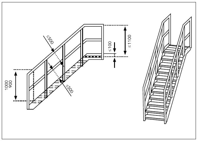 Figura 1 – Ejemplo de un guardacuerpo de escalera y su continuidad con un guardacuerpo horizontal (Fuente: UNE-EN ISO 14122-3:2017) (1).
