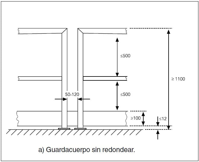 a) Barandillas con extremo en ángulo recto (véase la fi-gura 4 a), el espacio libre entre los segmentos será igual o mayor a 5 cm e inferior a 12 cm. Esta condición también será aplicable a los pasamanos;