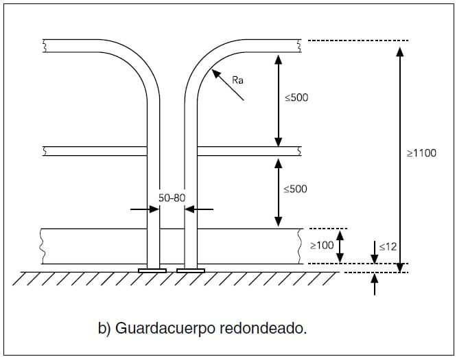 b) Barandillas con extremo redondeado (véase la figura 4 b), el espacio libre entre los tramos será igual o mayor a 5 cm e inferior a 8 cm. El radio Ra debe ser de 20 cm como máximo.