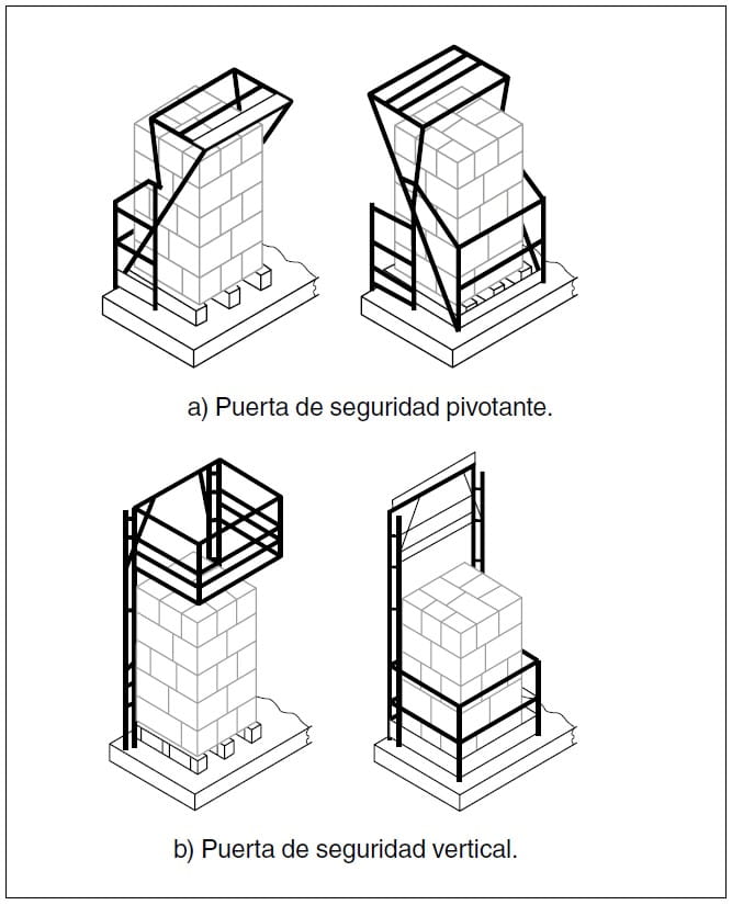 Figura 7 – Ejemplos de los principios de funcionamiento de las puertas de seguridad de entreplantas/altillos (Fuente: UNE-EN ISO 14122-3:2017).