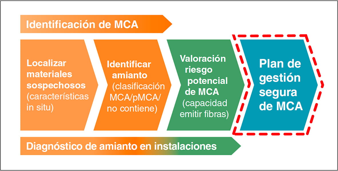 El primer paso para abordar el riesgo de exposición al amianto debería ser la localización y diagnóstico de amianto en los lugares de trabajo con el fin de implantar un “plan de gestión segura de MCA” en la organización, según recomienda la Guía Técnica para la evaluación y prevención de los riesgos relacionados con la exposición al amianto del INSST (véanse apéndices 1 y 2). Se entiende por “gestión segura de los MCA” el conjunto de acciones que el empresario adopta en cualquier tipo de organización para evitar y/o controlar los riesgos de exposición a fibras de amianto (véase figura 1). Más información en las NTP 1195 y 1196.