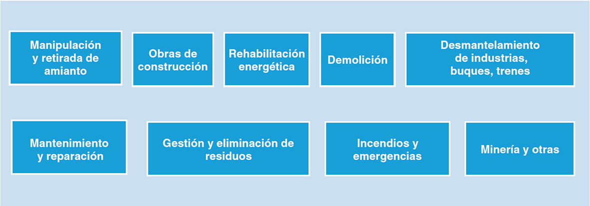 Determinadas actividades profesionales presentan, por su naturaleza y lugar de ejecución, una elevada probabilidad de encontrar MCA y perturbarlos de forma que pueden liberar las fibras de amianto que contienen al ambiente y provocar una contaminación prolongada de los recintos o locales, cuya reocupación segura requerirá un proceso de descontaminación complejo y costoso. En particular, trabajos de rehabilitación, reformas, reparaciones, siniestros y emergencias, instalaciones de climatización, suministros (gas, electricidad, agua), gestión de residuos, inspección, etc., en edificaciones o instalaciones anteriores a la prohibición, realizadas frecuentemente por PYMES o personas trabajadoras por cuenta propia (4).