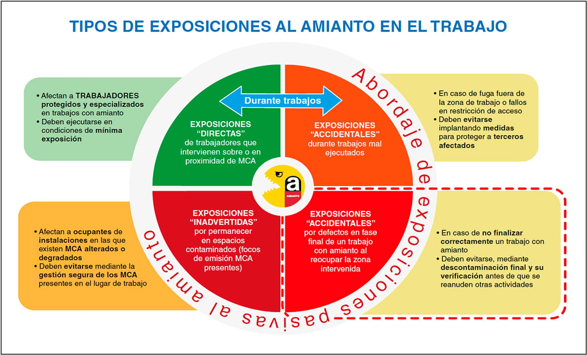Finalmente, otro tipo de exposiciones “pasivas” deno-minadas “inadvertidas”, que se producen por desconocer la presencia de los MCA y no gestionarlos adecuadamente, deben evitarse mediante la identificación de MCA y su gestión segura, centrada en evitar la emisión de sus fibras al ambiente; es decir, que no sean focos de emisión al perturbarlos inintencionadamente o por su estado de degradación.