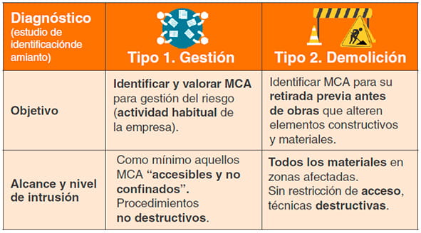 Si no hay información o el registro de MCA no es su-ficiente (por ejemplo, para retirada previa antes de una demolición), o si existen dudas sobre su exactitud o fiabilidad, será necesario realizar un “estudio de localización e identificación de MCA” específico para examinar la pre-sencia de amianto, antes de acometer cualquier actividad que pueda alterar los MCA presentes. En la figura 6 se recogen objetivos, alcance y nivel de intrusión para los 2 tipos de diagnóstico o estudio de identificación recomen-dados por el INSST en la citada Guía Técnica.