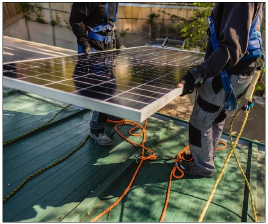 Figura 10. Utilización de línea de anclaje horizontal con un equipo de amarre y absorbedor de energía integrado en colocación de placas solares.