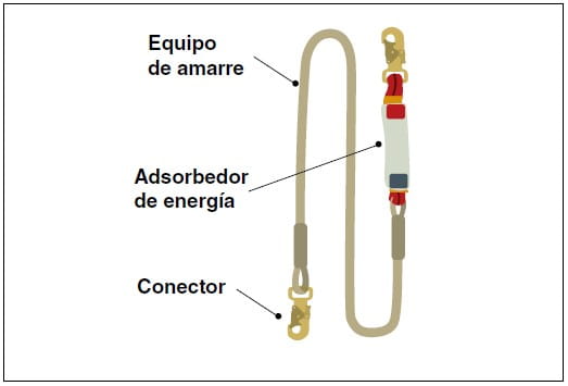 - Absorbedor de energía (UNE-EN 355:2002 ”Equipos de protección individual contra caídas de altura. Absorbedores de energía”) con equipo de amarre integrado (UNE-EN 354:2011 ”Equipos de protección individual contra caídas. Equipos de amarre”) (ver figura 4). Es importante destacar que no se puede usar un equipo de amarre sin un absorbedor de energía para detener la caída en este tipo de sistema.