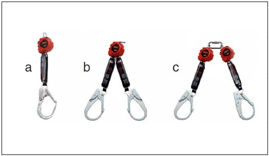 Figura 5. Configuraciones de dispositivos anticaídas retráctil: Un tambor y un elemento de amarre (a), un tambor y dos elementos de amarres (b) y dos tambores y dos elementos de amarre (c).