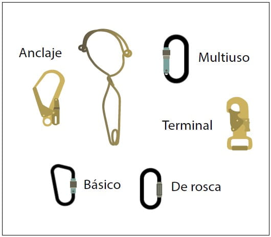 Para unir todos los componentes del sistema anticaí-das indicados anteriormente se deben utilizar los conectores. Estos deben ser adecuados para cada tarea según los diferentes tipos a los que hace referencia la UNE-EN 362:2005 “Equipos de protección individual contra caídas de altura. Conectores” (ver figura 8).