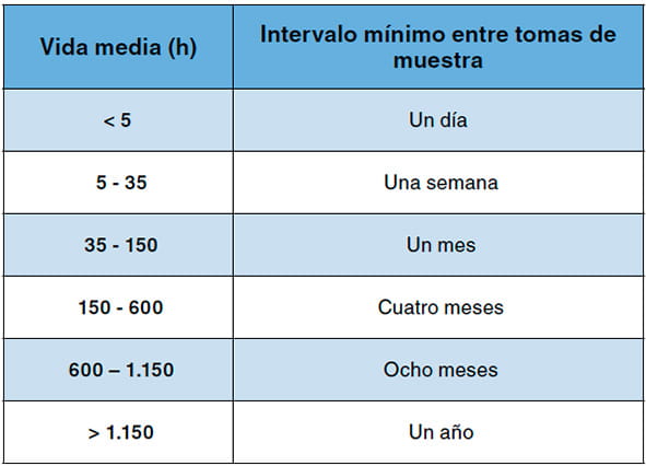 La utilización del control biológico implica la medición a intervalos regulares de los IB con objeto de conocer la evolución de los resultados en el tiempo y, en caso de obtenerse medidas anómalas, analizar la situación e intervenir antes de que se produzcan efectos para la salud. Dependiendo de la velocidad de eliminación del con-taminante o del metabolito, una medida biológica puede verse influenciada por la exposición del día, la semana o los meses anteriores a la toma de muestra. Por ejemplo, en el caso del plomo en sangre, que tiene una vida media de alrededor de 35 días, las medidas tomadas en dos días consecutivos reflejarán esencialmente la misma información, es decir, la exposición de los últimos meses. Cuando se desee utilizar la medición del IB para observar los cambios que se hayan producido en la dosis interna, por ejemplo, por la disminución de las concentraciones ambientales de contaminantes o por la utilización de equipos de protección individual, es necesario dejar un tiempo entre las tomas de muestra para que las mediciones biológicas puedan mostrar los cambios que se hayan producido. Los intervalos de tiempo entre dos muestras pueden estimarse en base a la vida media de los diferentes parámetros biológicos. En la tabla 1 se puede observar la periodicidad aproximada entre las tomas de muestra en función de la vida media de los diferentes indicadores biológicos.