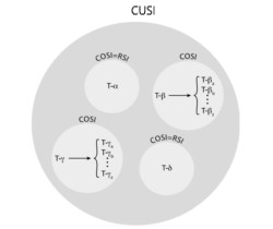 La figura 1 representa, de forma esquemática, estos tres índices (RSI, COSI y CUSI) y cómo se relacionan entre sí; a la vez que presenta la nomenclatura que se utilizará más adelante cuando se desarrollen los índices COSI y CUSI. La figura muestra un círculo que engloba cuatro círculos más pequeños. Estos cuatro círculos corresponden a cuatro tareas diferentes (T-a, T-b, T-g y T-d) que se realizan a lo largo de la jornada laboral. En esta situación, el índice CUSI se utiliza para evaluar el riesgo del conjunto de estas cuatro tareas. A su vez, cada una de estas cuatro tareas puede estar compuesta por una o varias subtareas; de forma que, de acuerdo con la figura 1, las tareas T-b y T-g están compuestas por las subtareas T-ba … T-bz y T-ga … T-gz respectivamente. Es importante señalar que, a diferencia de las tareas, que se enumeran utilizando los caracteres del alfabeto griego (a, b,… w), las subtareas se enumeran mediante caracteres del alfabeto latino (a, b,… z). El índice COSI se utiliza para evaluar el riesgo asociado a las tareas compuestas T-b y T-g teniendo en cuenta sus subtareas correspondientes. En el caso de las tareas T-a y T-d, al no ser compuestas, el índice COSI se reduce al cálculo del índice RSI. Los cuatro índices COSI así calculados son los que se utilizan para integrar las tareas al nivel de jornada laboral mediante el cálculo del índice CUSI.
