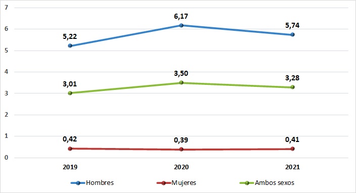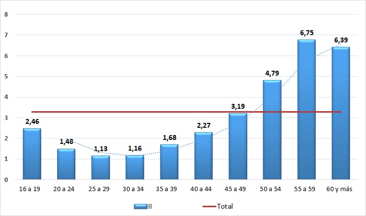 | 25 a 44 años | 3,0 | 0,3 | 1,7 |