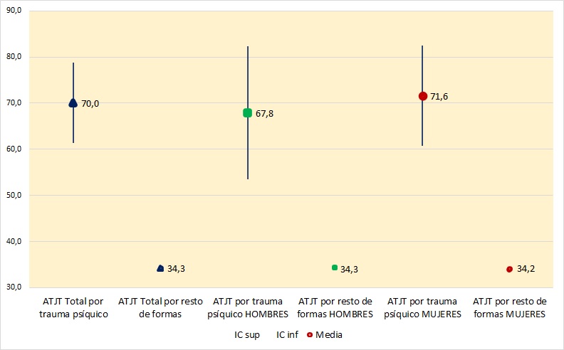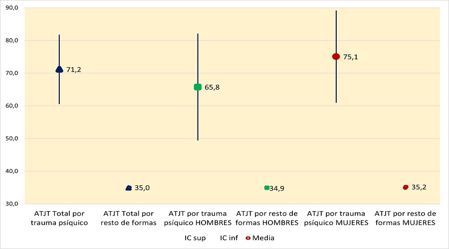 Al analizar el sexo y la edad de manera conjunta, se aprecia que la incidencia aumenta con la edad, siendo las mujeres de hasta 29 años, con un índice de 5,7, aquellas que presentan mayores incidencias de ATJT por trauma psíquico. De entre los hombres, son los de 30 a 39 años quienes muestran unos índices de incidencia mayor, (3,6), junto con los más mayores de 50 años en adelante (3,4).