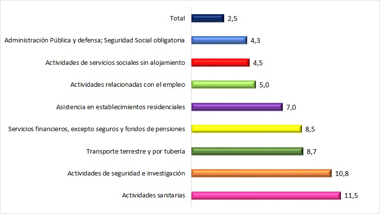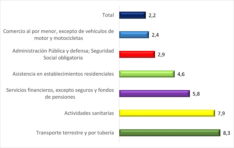 Al estudiar este tipo de accidentes en las diferentes actividades económicas, destacan: las actividades postales y de correos, con un índice de incidencia de ATJT por trauma psíquico de19,8, el transporte terrestre y por tubería, con 18,6, las actividades sanitarias, (13,7) y asistencia en establecimientos residenciales (11,3).