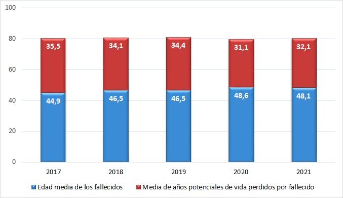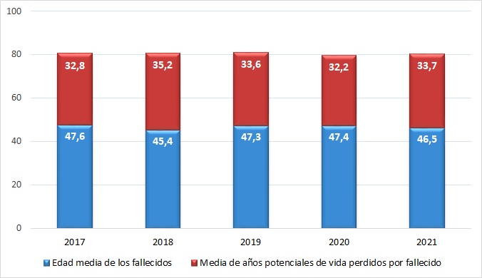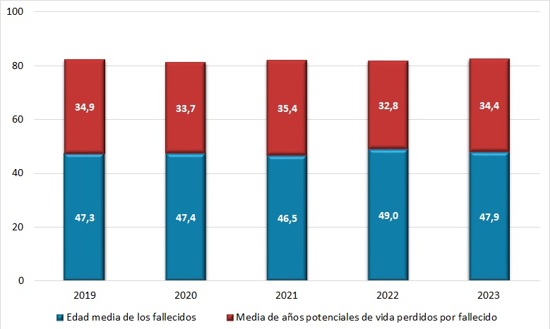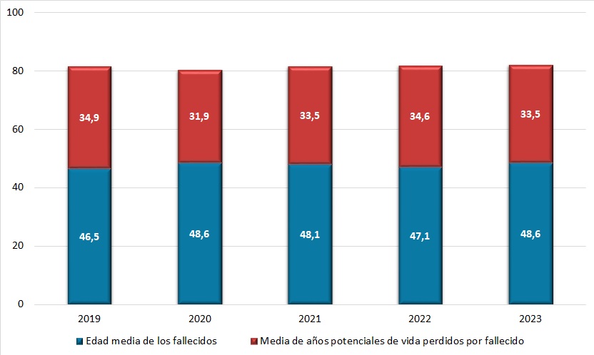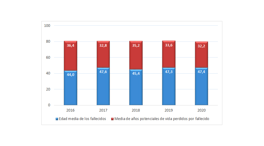 Para los accidentes de trabajo mortales relacionados con el tráfico, la edad media de los hombres fallecidos fue de 47,7 años, por lo que el promedio de años de vida perdidos en cada accidente de este tipo fue de 34,7 años. Para las mujeres la pérdida potencial fue mayor en este tipo de accidentes (39,4 años de promedio) debido a que la edad media de las mujeres fallecidas fue de 48 años.