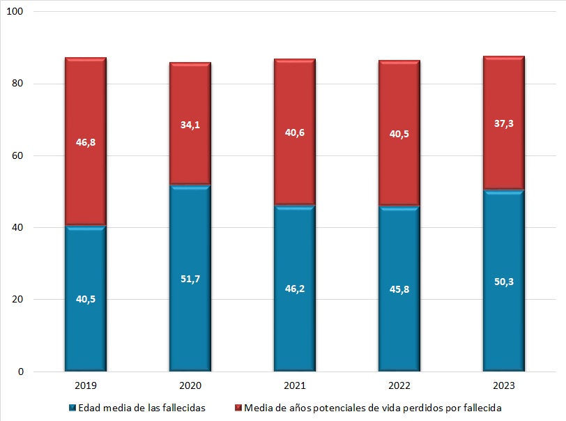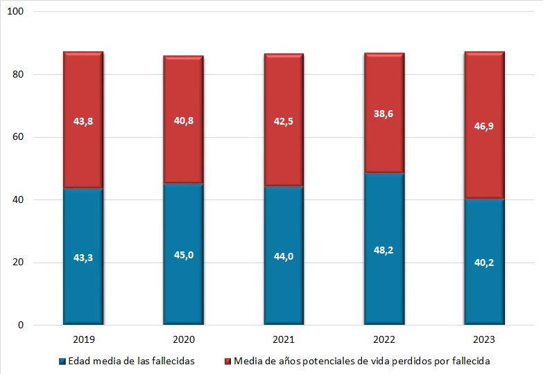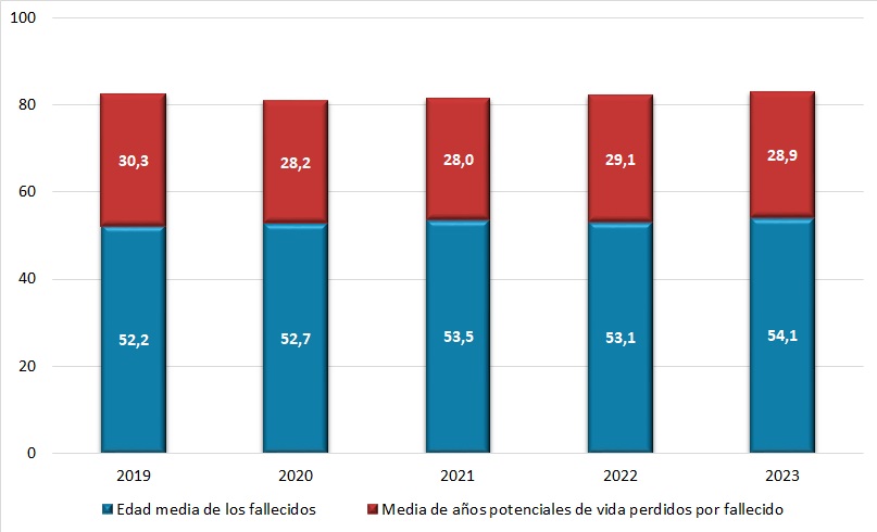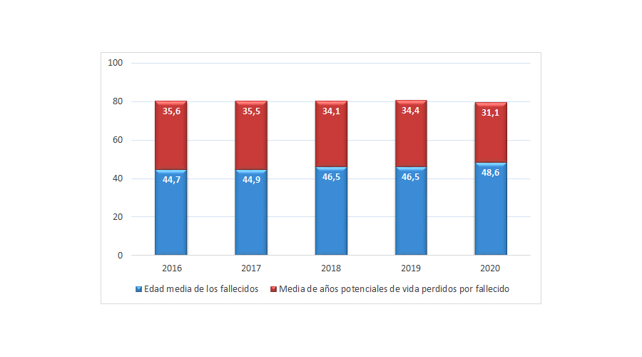Los accidentes de trabajo debidos a patologías no traumáticas son los que presentan una mayor edad media de las personas trabajadoras fallecidas, por lo que los años potenciales de vida perdidos son menores que en los otros tipos de accidentes. En concreto, la edad promedio de los hombres fallecidos fue de 52,2 años, y la de las mujeres de 49. Esto se traduce en una pérdida potencial media de años de vida de 28,2 para los hombres y de 38,4 años para las mujeres.
