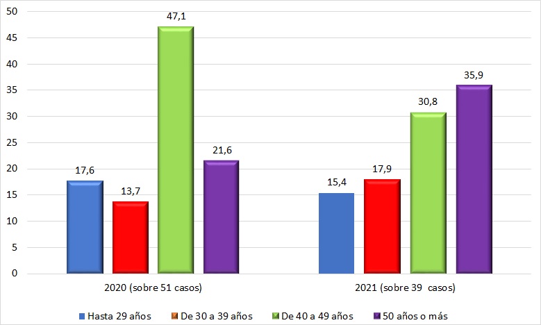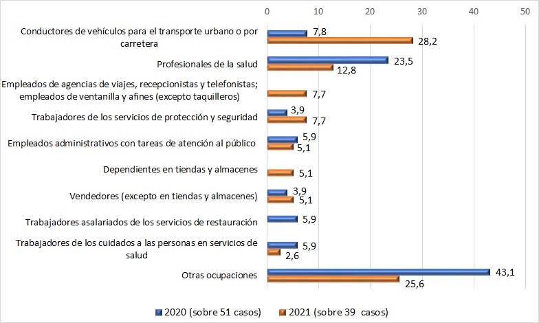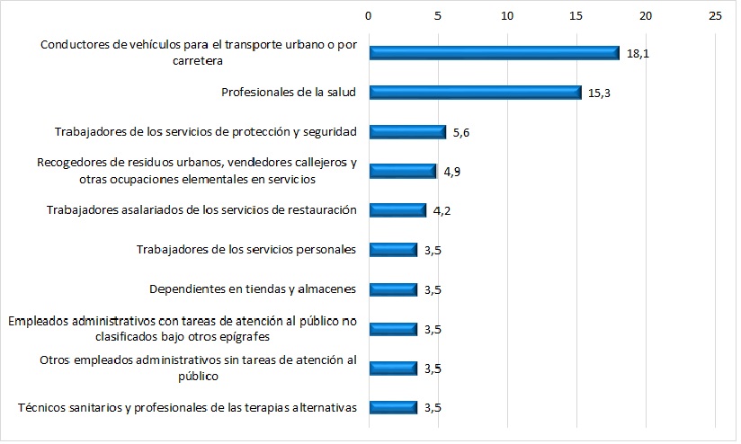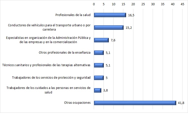 Entre las ocupaciones destacaron los profesionales de la salud (20,6 %) y los conductores de vehículos para el transporte urbano o por carretera, que aglutinan el 12,4 % de los trastornos mentales.