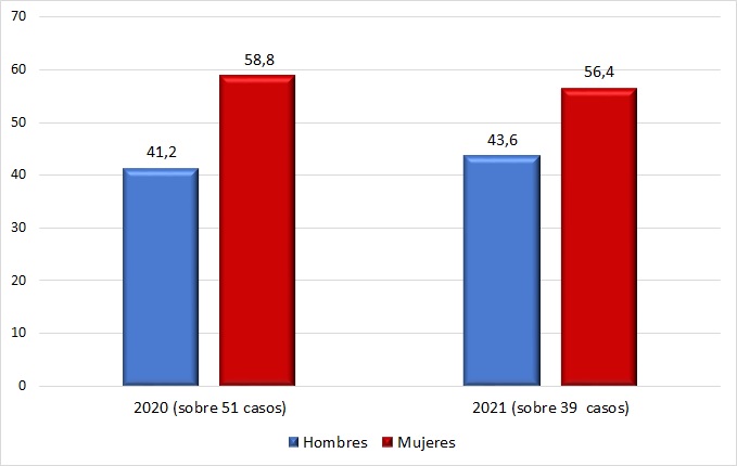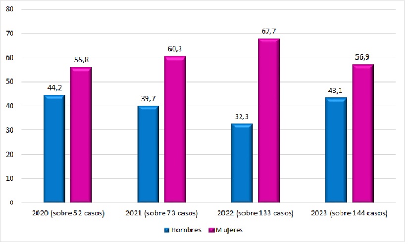 Al analizar el sexo de las personas trabajadoras afectadas por trastornos mentales en 2024, se observa que un 65 % los sufrieron mujeres y un 35 % los hombres.
