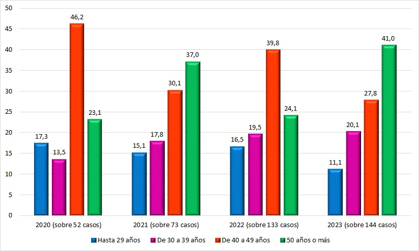 De los 170 casos de 2024, el 92,9 % fueron enfermedades causadas por el trabajo y el 7,1 % enfermedades agravadas por el trabajo. En 2023, el 87,3 % de los 134 casos fueron enfermedades causadas por el trabajo, datos similares al año 2022.