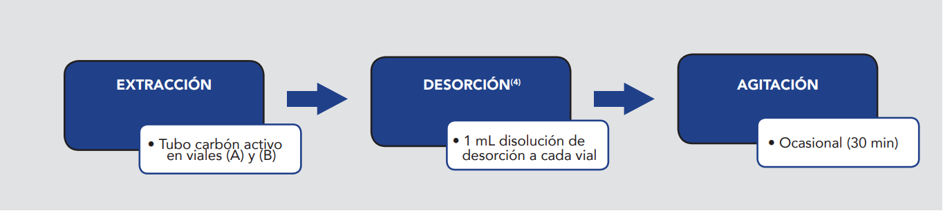 Se extrae por separado, en viales independientes, la sección A y la sección B del tubo de carbón activo. Se añade 1 mL de la disolución de desorción a cada vial. Se cierran los viales y se agitan ocasionalmente durante 30 min. Las muestras están listas para el análisis.
