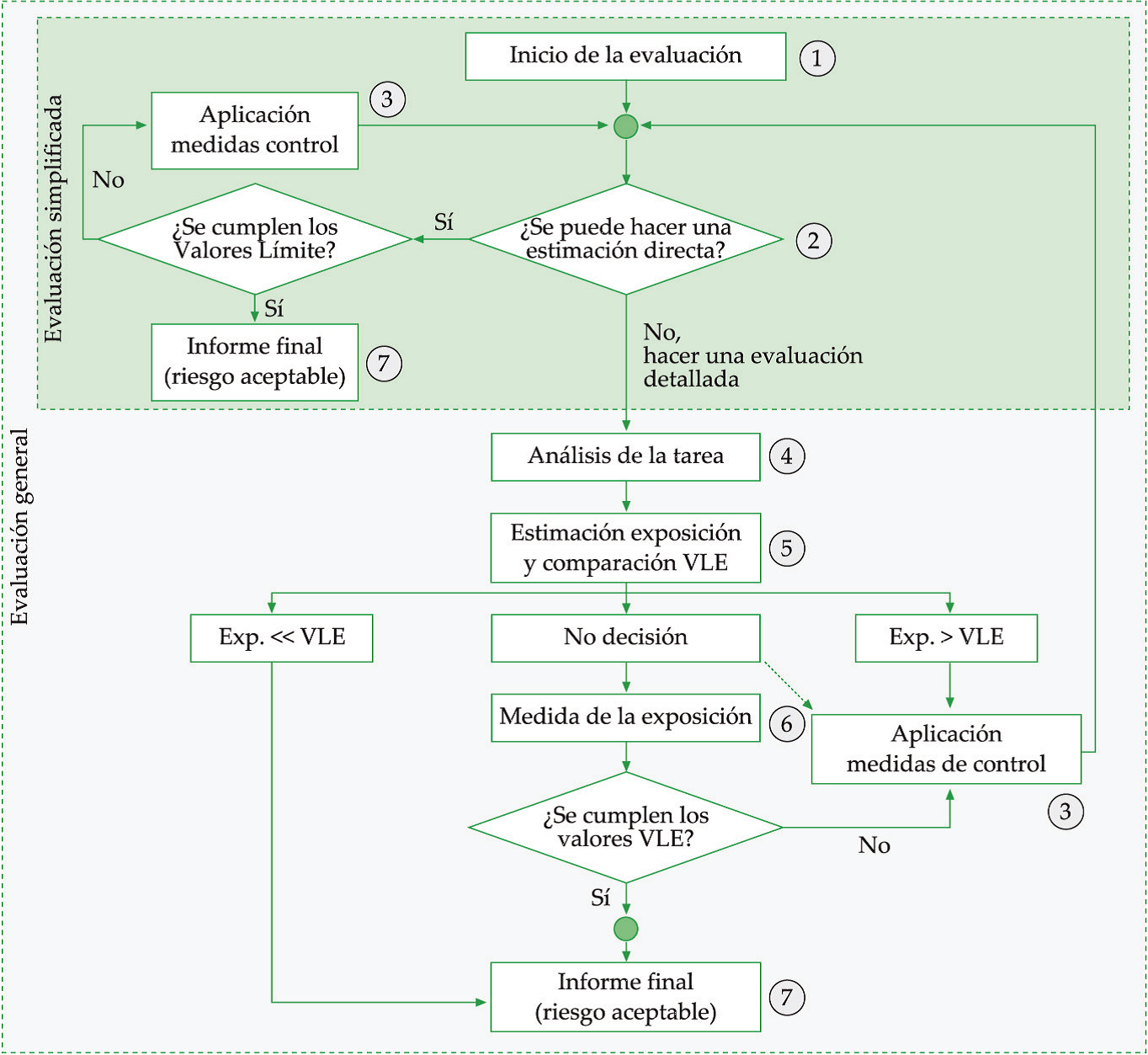 La evaluación de riesgos derivados de la exposición a radiaciones ópticas artificiales debe seguir las pautas básicas: identificación de peligros, una eliminación de los que lo permitan, una evaluación de los riesgos y posterior comparación con los valores de referencia y el establecimiento de medidas de prevención y protección en función de los resultados.