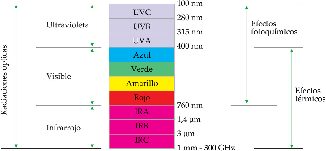 Al igual que ocurre con el resto de ondas electromagnéticas, las clasificadas como radiaciones ópticas se pueden dividir en varias subclases en función de sus características físicas de frecuencia y longitud de onda. Cada uno de estos tipos tendrá unos intervalos de energía asociados y, por lo tanto, unos efectos característicos al interactuar con la materia.