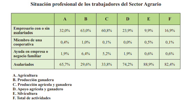En la siguiente tabla se observa como la situación profesional difiere bastante del total de actividades (con la excepción de Silvicultura), existiendo una proporción de empresarios con o sin asalariados mucho más elevada en detrimento de la proporción de asalariados.